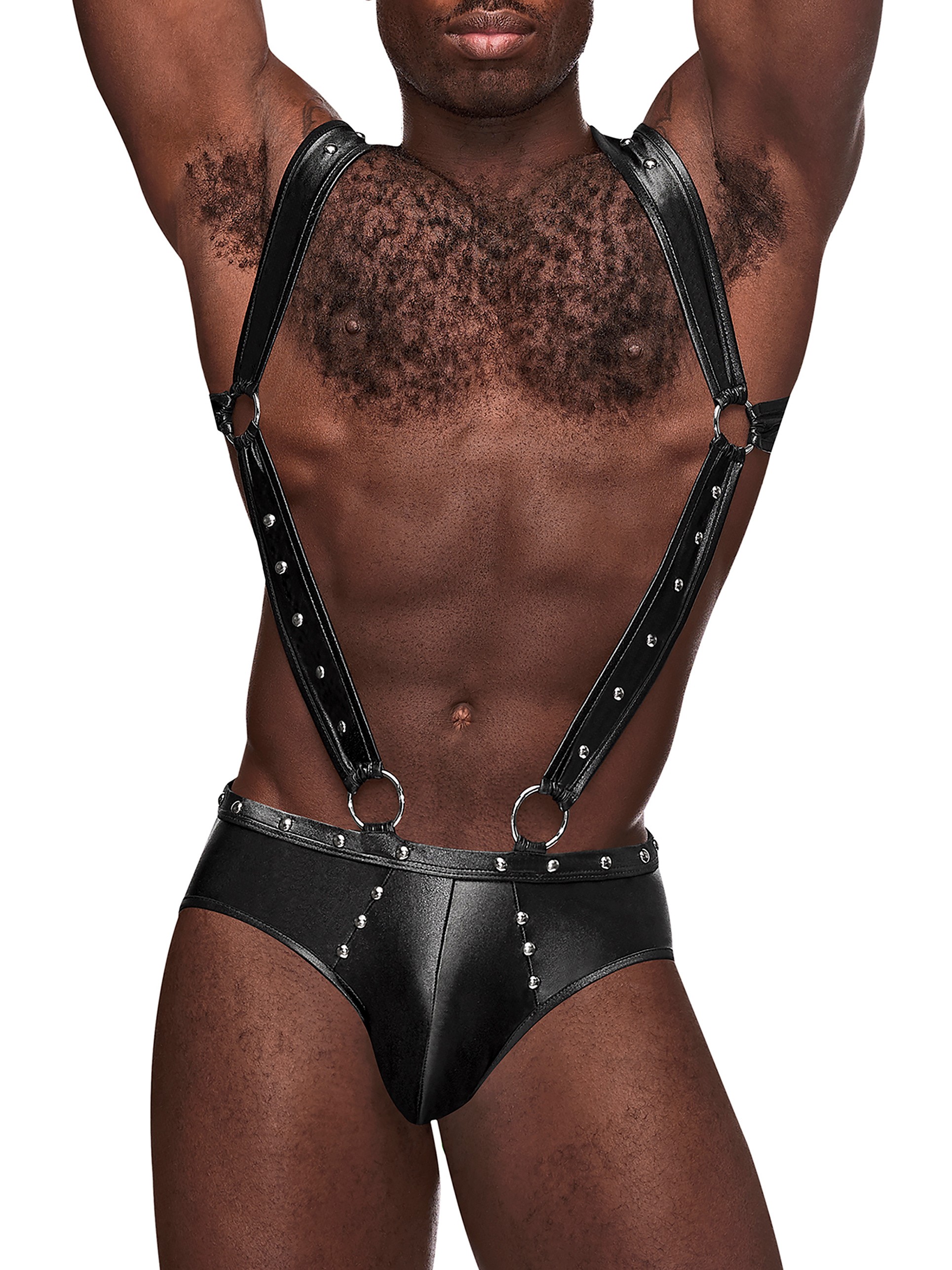 - Features suspender straps, harness-style back, and cut-out rear for all kinds of kinky appeal