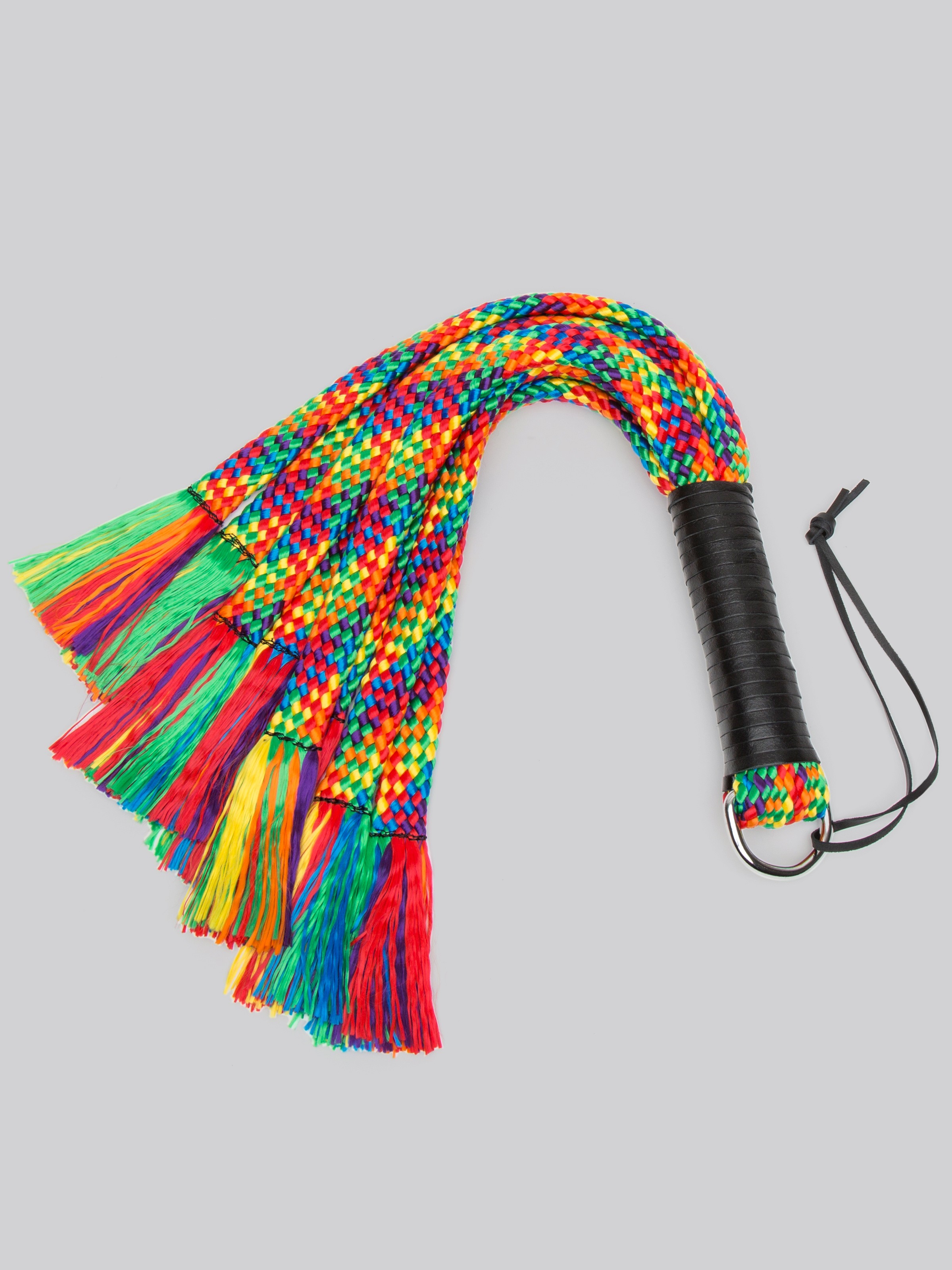 Be proud of your power play with a flashy flogger in rainbow-coloured hues. Thwacks get fancy here with a soft-and-silky finish on the fronds, a non-slip leather handle and a wrist-loop to give your spanks and slaps extra flamboyance.
