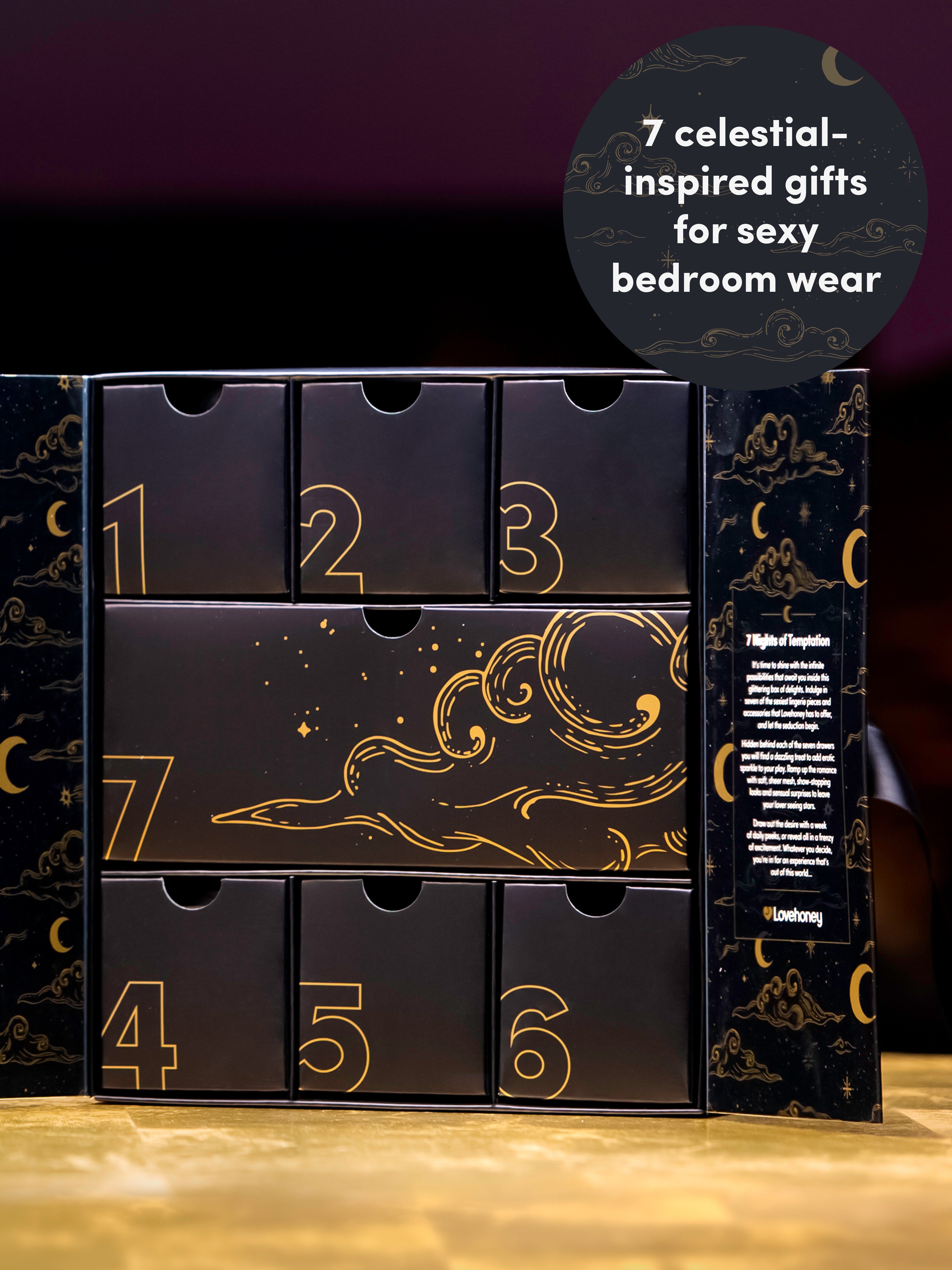Send your lover into orbit with the 7 Nights of Temptation gift set featuring seven of our sexiest lingerie pieces and accessories. Hidden behind each door is another element to add to your erotic ensemble, for out-of-this-world midnight seduction.