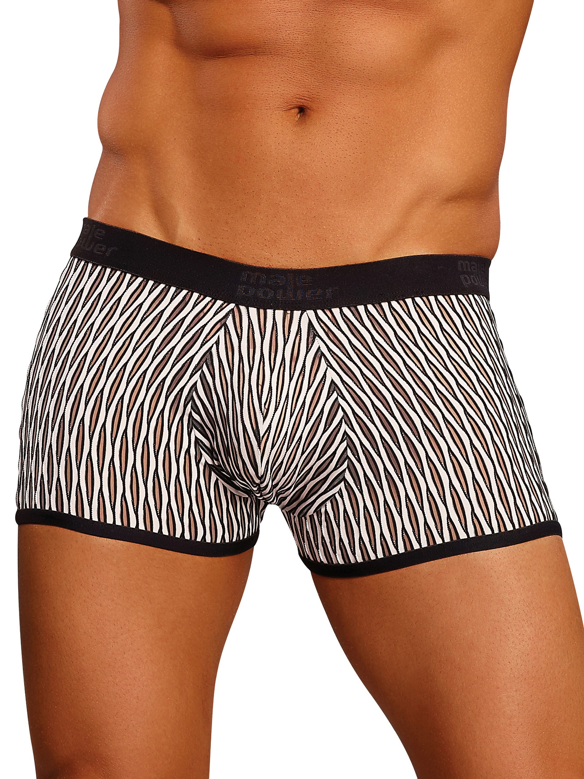 Unleash your wild side and give a cheeky glimpse of flesh with these statement striped boxer shorts from Male Power. In a loud-and-proud black and white design, the waves adorning these cheeky boxers curve and centre around the main event – your package.
