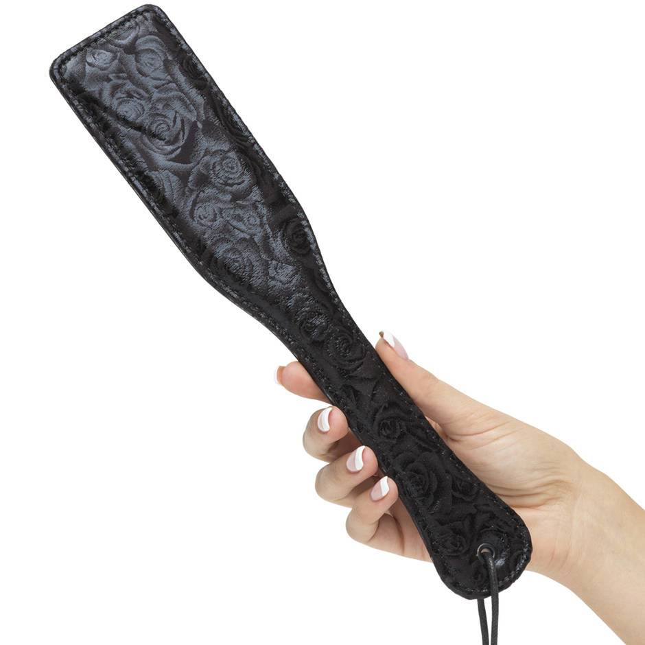 While the broad, slightly flexible spanking surface delivers scintillating slaps and orgasmic thrills, its sturdy handle with wrist loop gives you the power to assert your dominance with confidence. Choose the rose-patterned side for muffled thuds and soothing strokes, or the smooth leather surface for audible spanks that leave a mark.