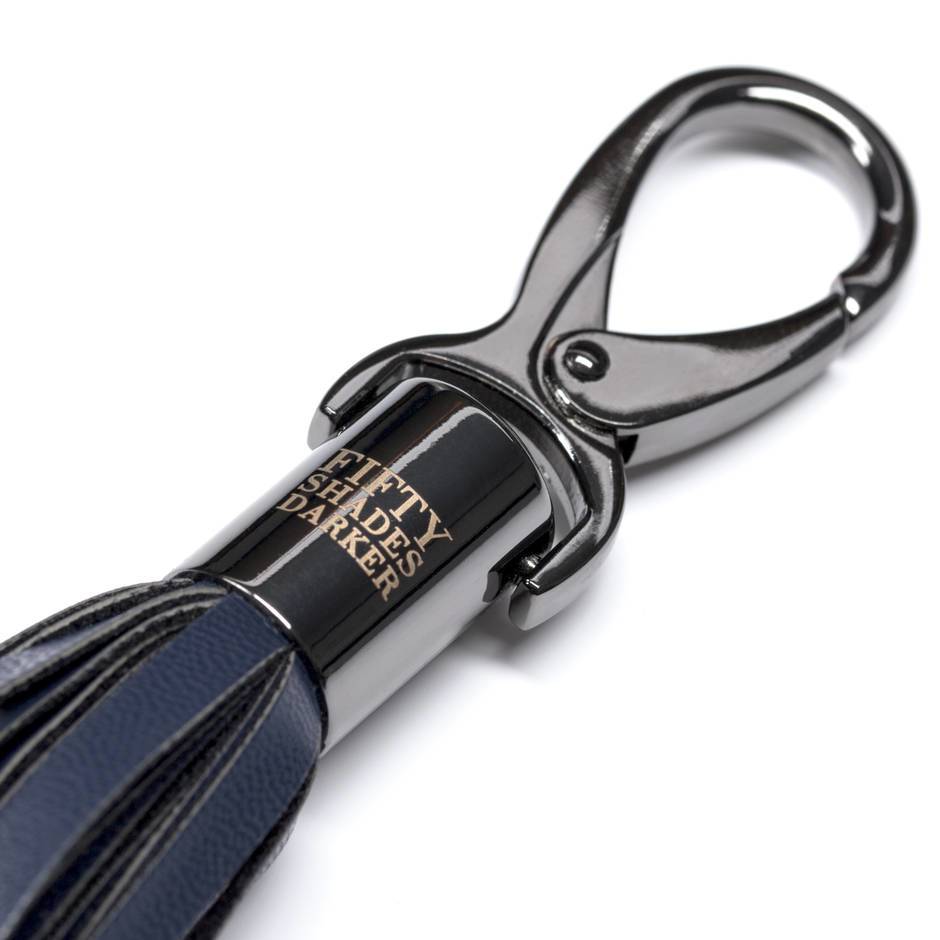 The flogger. The stroking stopped for a few moments and as I started to wonder why he had stopped I heard a whoosh and felt the slightest sting across my breasts. This flogger is petite and navy blue with a gunmetal grey handle. As with all the other products in this set it adorns the Fifty Shades of Grey label.