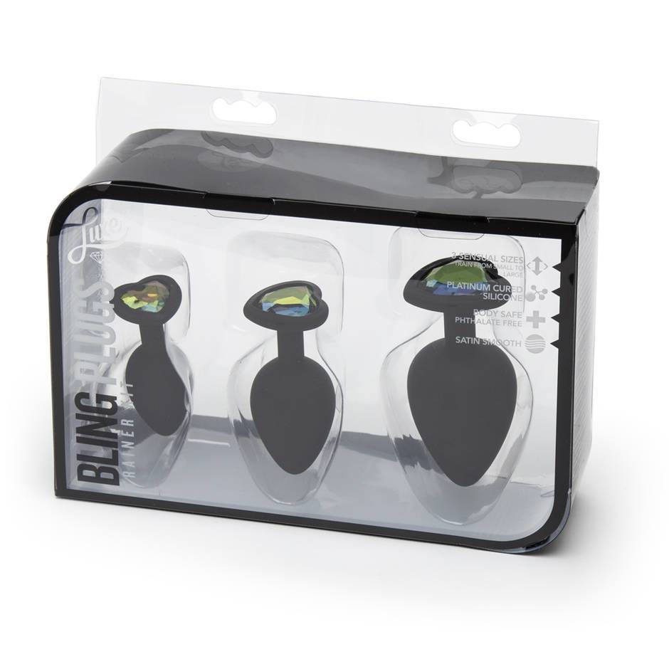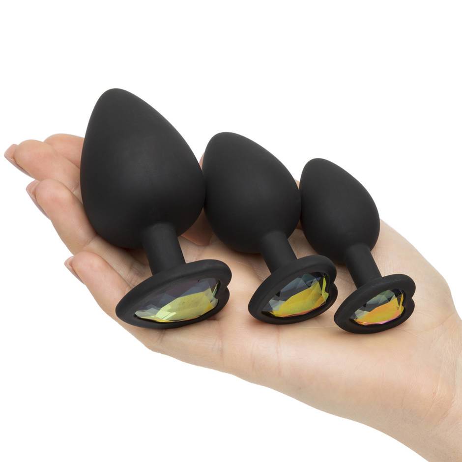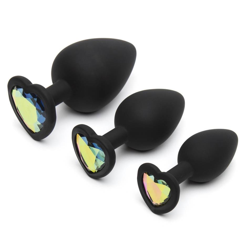- A trio of sensual butt plugs in soft silicone, featuring bedazzling heart-shaped multicoloured crystal bases