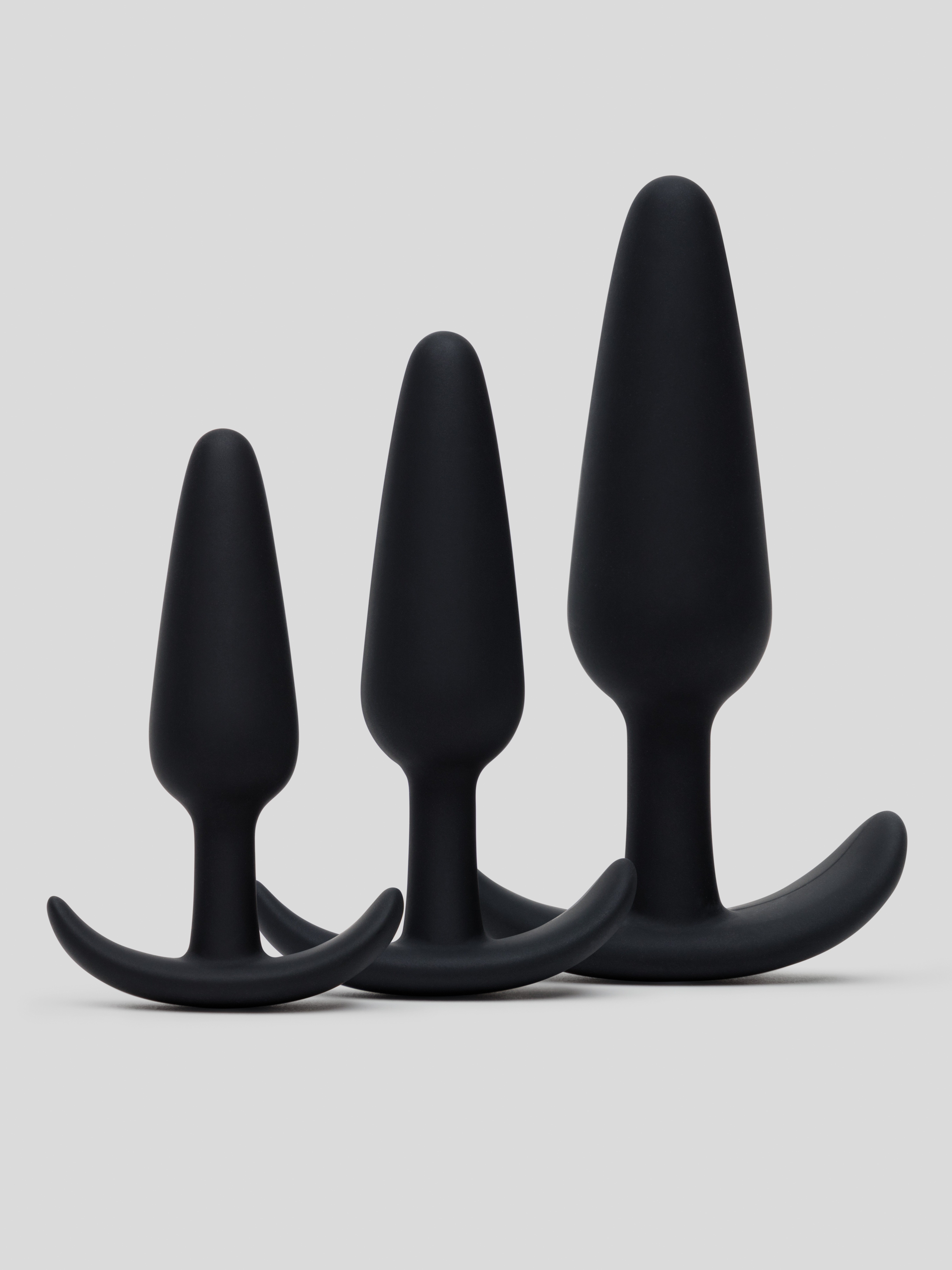 No ifs, just butts. Bump up your rump's pleasure with this butt plug trio training set. Featuring plugs in three sizes for graduated enjoyment, each smooth silicone plug has a tapered tip, lengthy neck and T-bar base for peace of mind while you play.